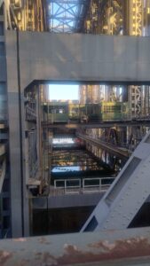Grandios – im wahrsten Sinne des Wortes und vor allem, als es dann tatsächlich passiert: genau in dem Augenblick, als wir bewundernd und beeindruckt schauen, kommt ein Schiff, ein großer Lastkahn, und will sich transportieren lassen! Langsam hebt sich das gigantische Wasserbecken 36 Meter hoch nach oben, stoppt dort eine Weile, man hört das Schiff hineinfahren, das Metall ächzt unter der Last, es ruckelt mehrfach, Wasser läuft aus und tropft nach unten. Und dann setzt sich das Ganze Meter um Meter wieder in Bewegung und landet schließlich auf unserer Ebene, das hintere Tor wird geöffnet und das Schiff kann hinaus fahren.